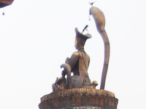 | さて、王宮前には下の写真のような、不思議な像が立っています。 祈りをささげる王様、その後ろにたたずむのは王様を守るコブラ。 なんとコブラの頭の上にはちょんと小鳥さんが乗っています。 |